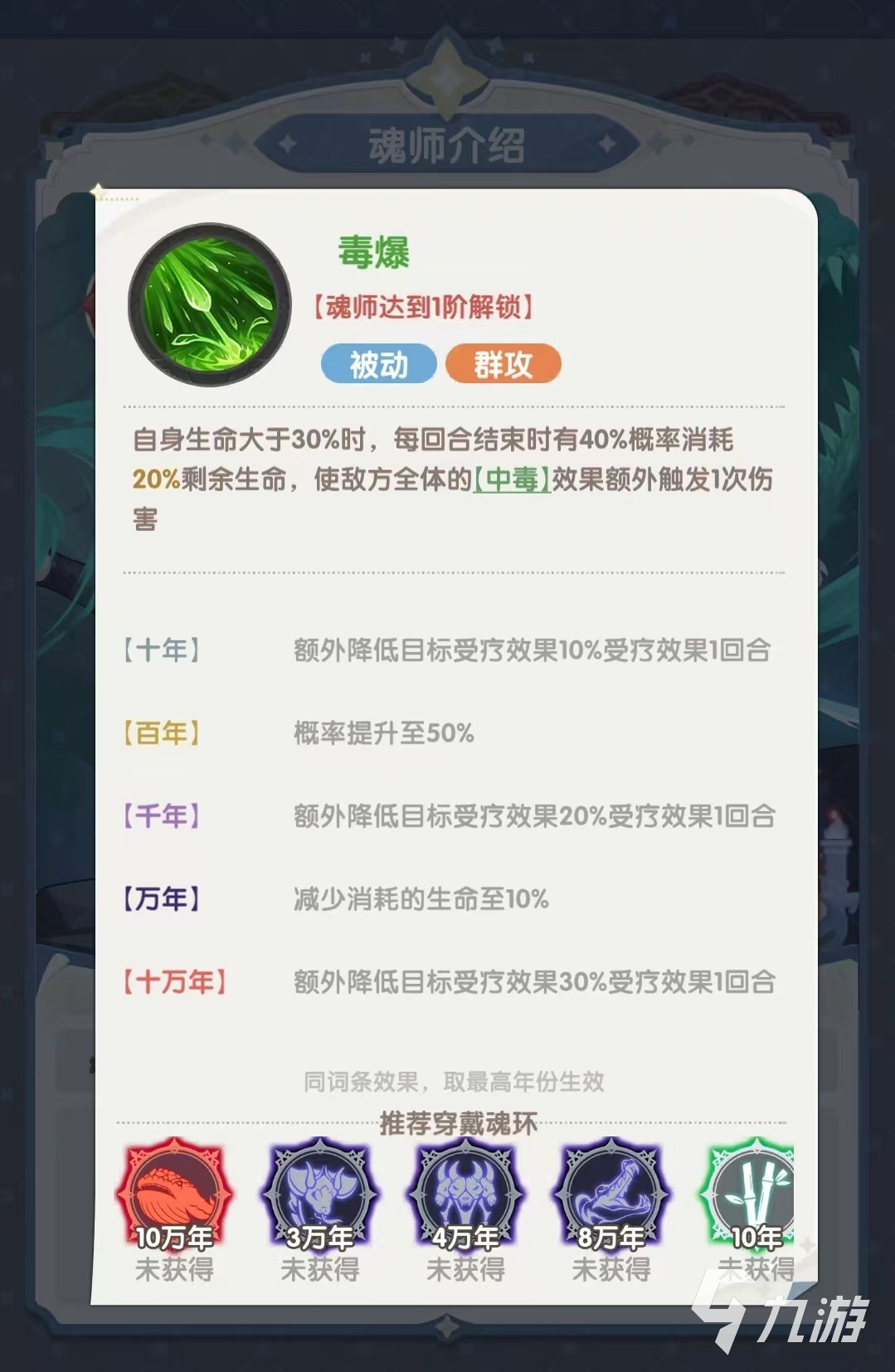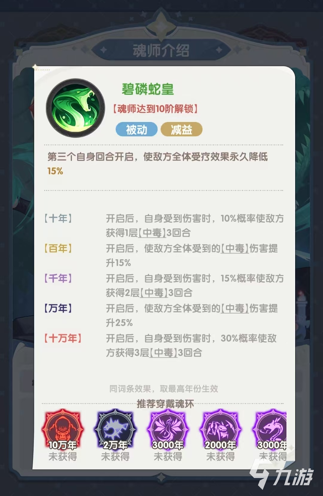 第3个被动碧磷蛇皇,第三回合开启效果,敌方方全体受疗效果永久降低15%。提升魂环年份后,开启武魂真身有几率使对方中毒,只要独孤博自身受到伤害,就有几率使对方中毒,魂环年份越高,叠加中毒层数越高,这些技能综合下来,可很快将对方全体都带上中毒效果。后续只需要随便放一下技能,保证石化几率,就可以发挥出自身的作用了。所以是一个比较好培养的角色,但是缺少爆发且控制不稳定是自身的缺点。