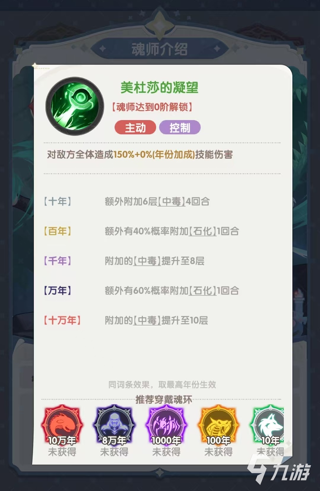 独孤博的主动技能美杜莎的凝望,对敌方全体造成技能伤害,通过提升魂环年份,达到可额外附加中毒、石化这两种效果。对方被中毒之后,每层都会造成2%最大生命值的持续伤害,叠加起来之后中毒损伤也很可观,石化使对方无法行动。如果能够装配十万年魂环,无论是中毒层数还是石化几率都很高,这也是独孤博能够成为出场几率非常高的控制性魂师的主要原因,