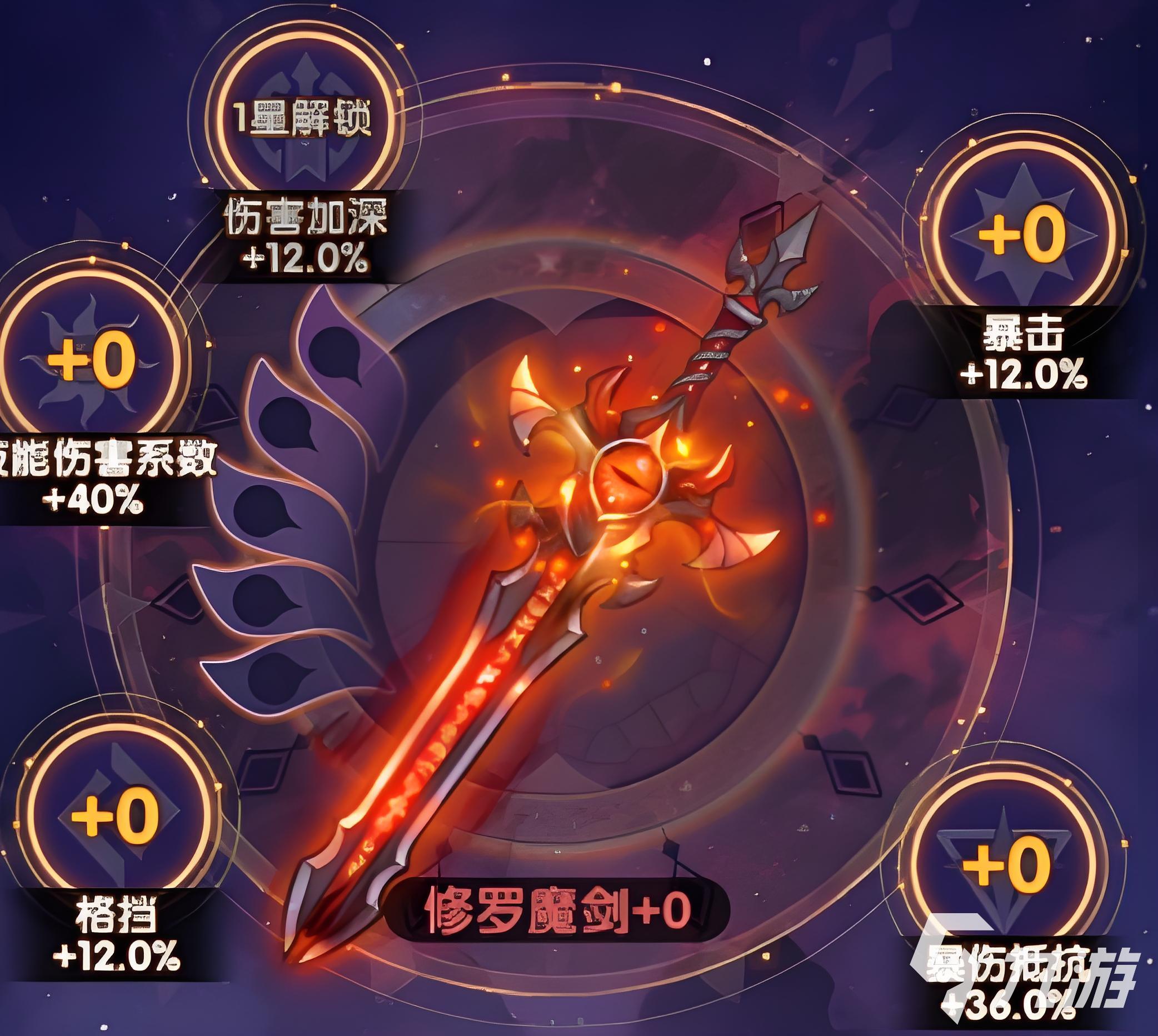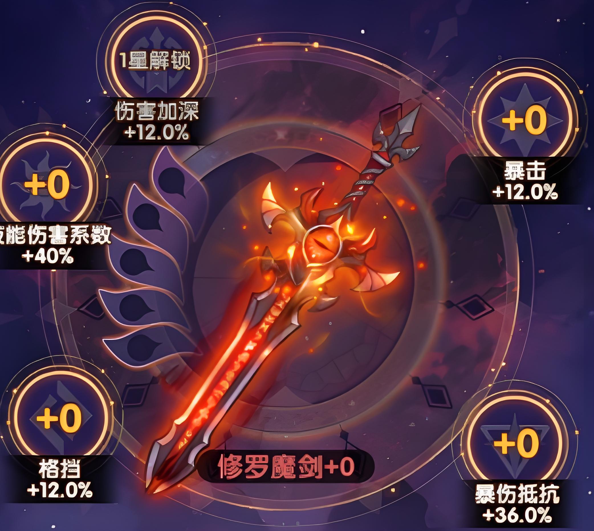 而说到圣物的携带,这携带是需要根据圣物的效果来的,什么样队伍就需要带拥有对应属性加成的圣物,所以带的时候需要先去了解效果,那么来看效果,这第一个要带大家看的圣物,叫做修罗魔剑,这圣物自带五个槽位。