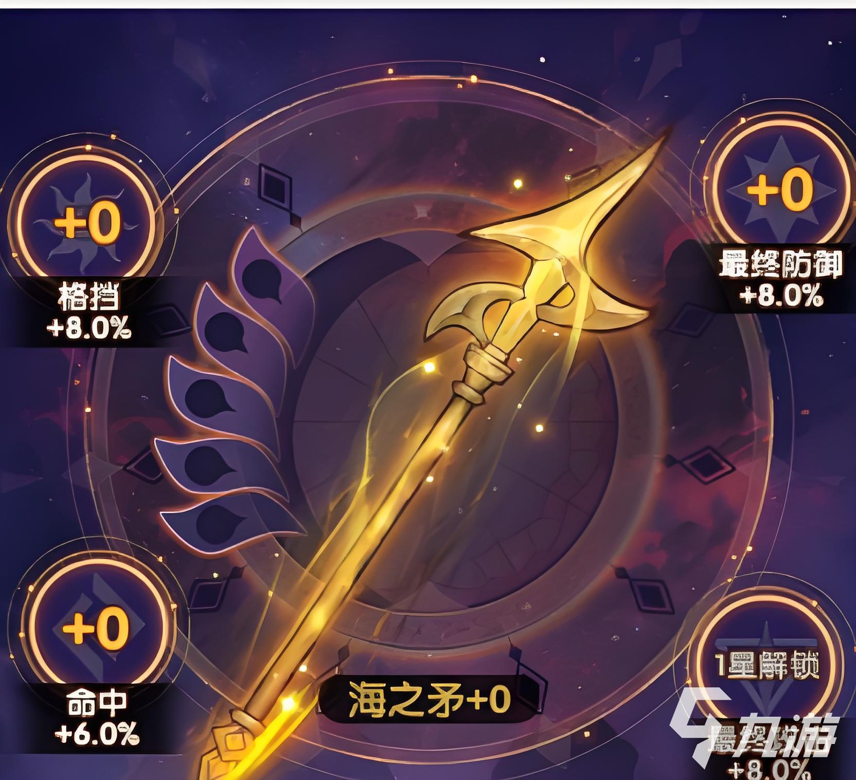 之后是第二个神器海之矛,这神器有四个槽位,这四个槽位拥有防御、攻击、命中和格挡加成,此外还拥有额外的格挡属性加成和增加自身击破的效果,这神器的话适合的阵容有很多,不挑阵容,可以自由搭配去使用。