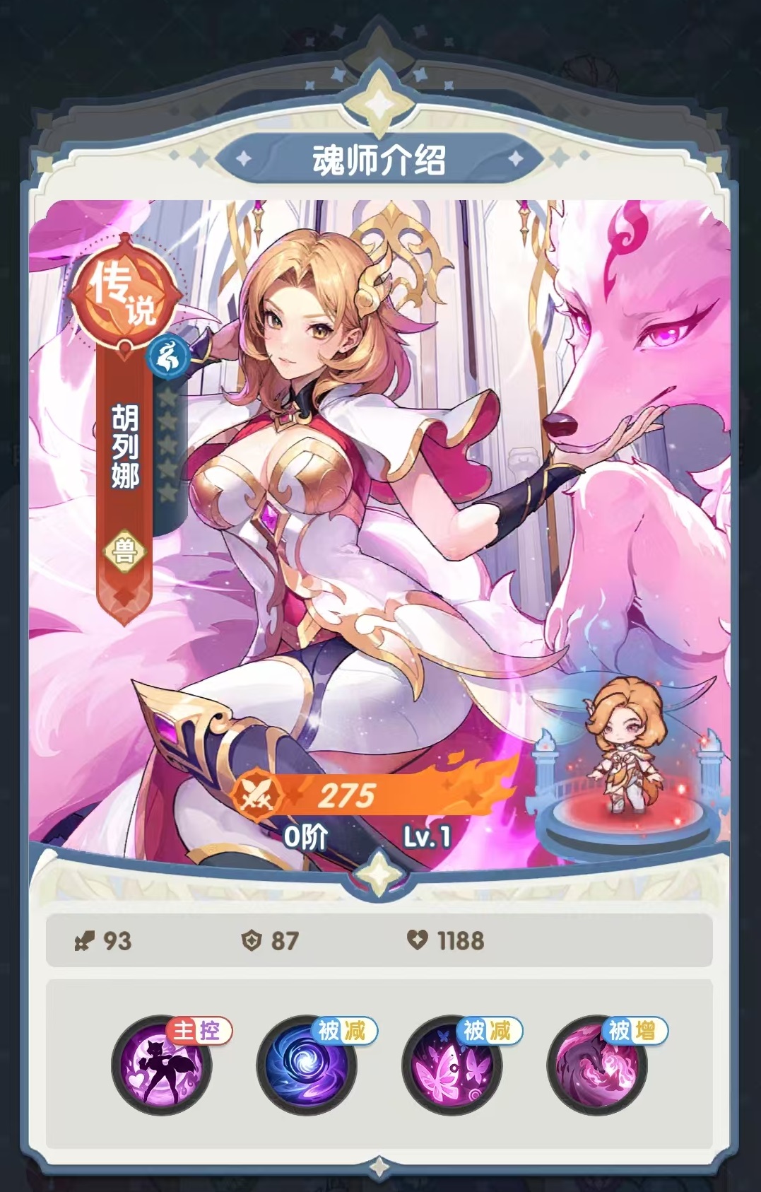 最后一个妖狐真身,第二回合释放,己方全体永久获得吸血加成,在自身攻击暴击时有几率眩晕,还有额外提升全体效果命中属性等。所以作为控制系魂师,胡列娜是非常称职的一个,她不仅可以有效的限制对方,自身在输出方面也非常出色,还可对整个队伍都有伤害方面的加成。阵容搭配小编推荐大家走反击流路线,选择古榕、尘心、胡列娜、邪月和宁荣荣。古榕是很好的前排肉盾,尘心作为强攻系魂师输出很高,尘心和邪月一起配合起来,在胡列娜的控制和增伤辅助之下输出非常暴力。