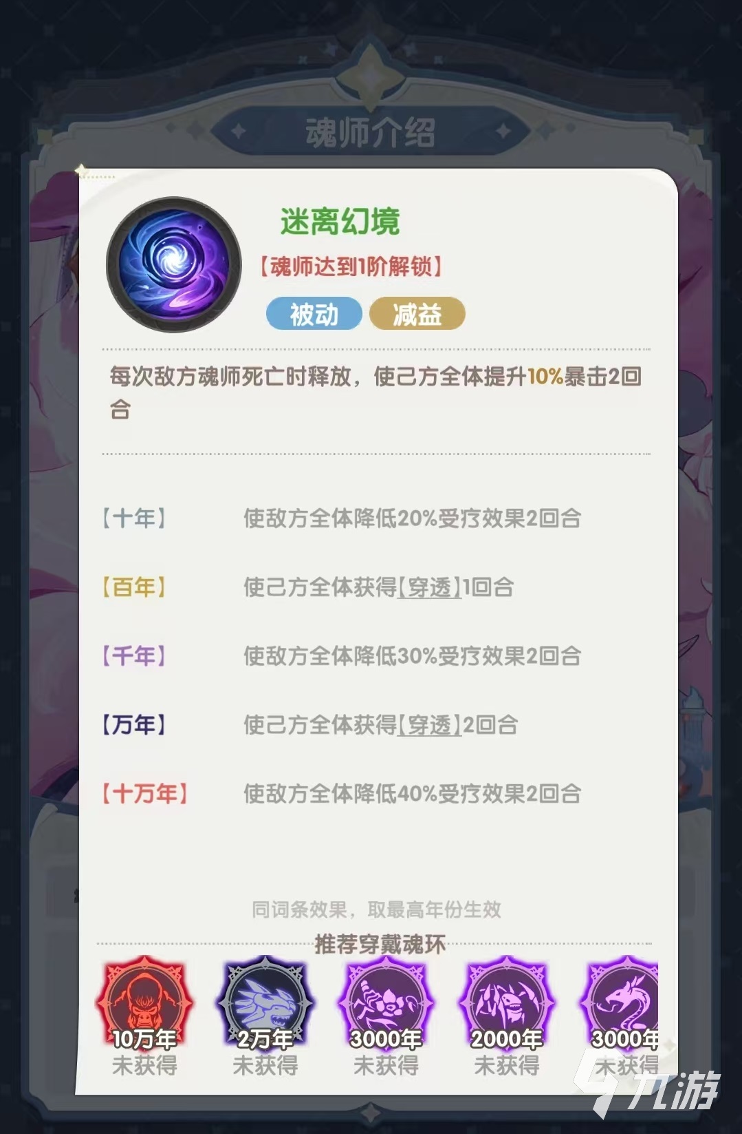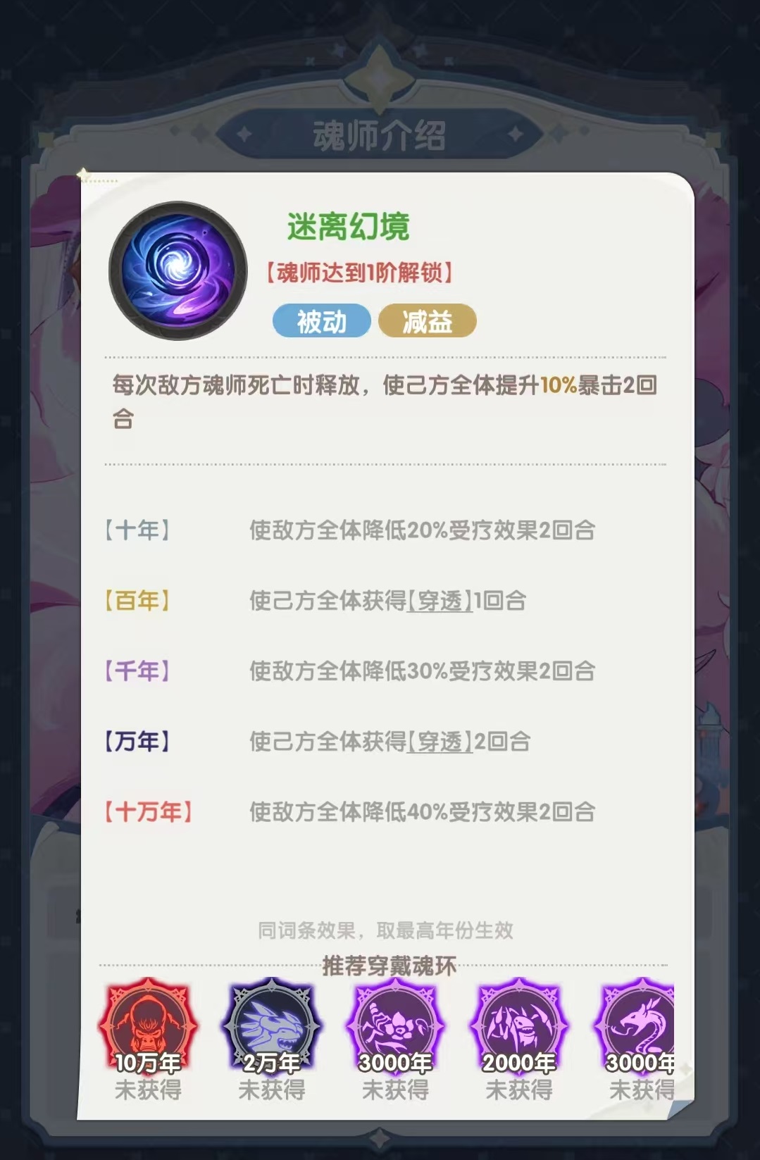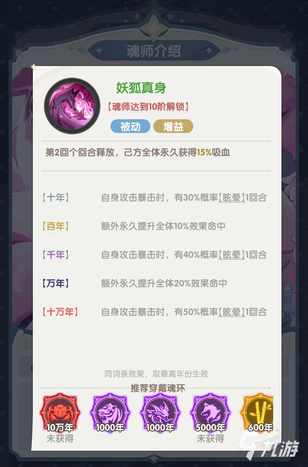 胡列娜的主动技能狐媚,可对敌方全体造成技能伤害,同时有几率附加魅惑和易伤这两个效果。达到10万年魂环时,魅惑的附加概率为80%,易伤的附加概率也是80%,都可以持续两回合。对方被魅惑后无法行动,在此期间受到的伤害无视防御,受到两次伤害后解除状态,易伤效果是使携带者受到的攻击伤害增加,这两个都可以加重对方受到的伤害,所以对强化己方的输出非常有帮助。