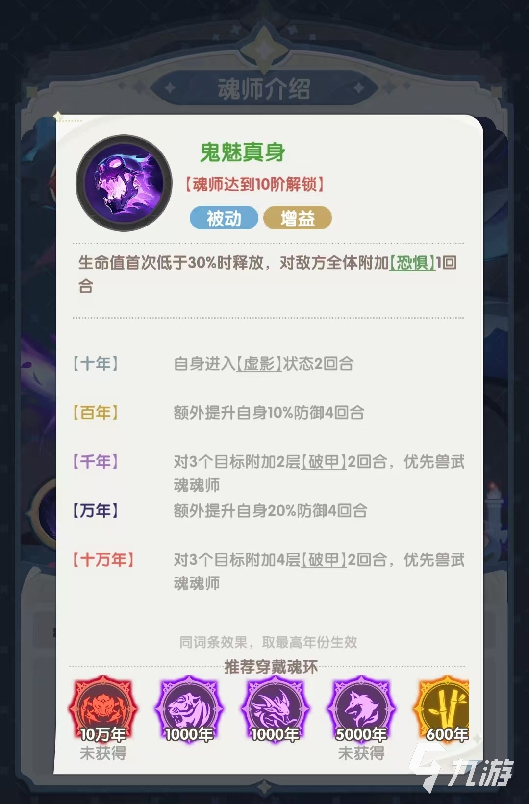 第2个被动效果是发动普攻后,对敌方随机一个目标再进行一次追击。提升魂环年限后,额外附加减防,对兽武魂魂师造成的伤害提升。最后一个被动鬼魅真身,在血量首次低于30%的时候释放真身,对敌方全体附加恐惧一回合,使对方的输出大幅度减少。同时自身进入到虚影状态,额外提升自身防御,对多个目标附加破甲。这个技能的效果比较全面,既提高了自身的生存能力,又削弱了对方的防御,方便后续爆发。