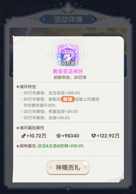 神域试炼开启,突破极限,冲击更高神阶!参与活动可获得进阶二级神祇材料「神明愿力」、20万年魂环「黄金圣龙神环」、「暗魔邪神虎神环」
