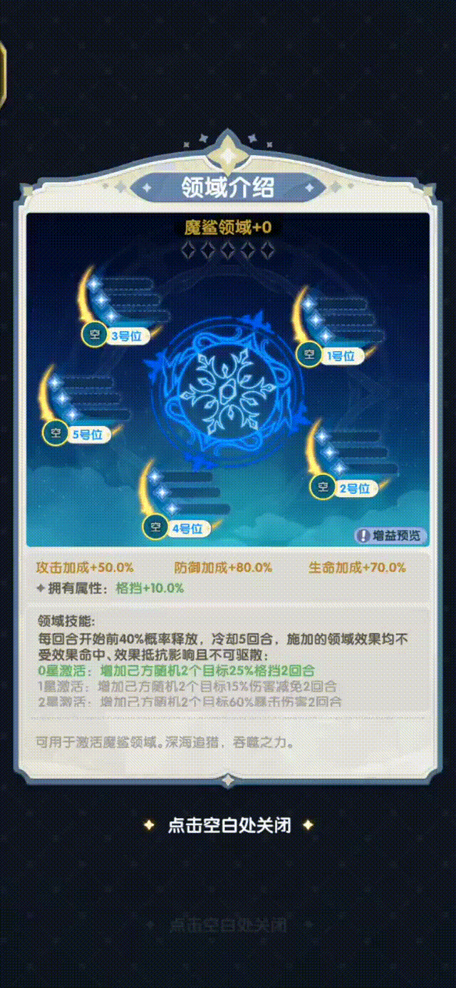 领域技能:每回合结束70%概率释放,冷却8回合,施加的领域效果均不受效果命中、效果抵抗影响且不可驱散