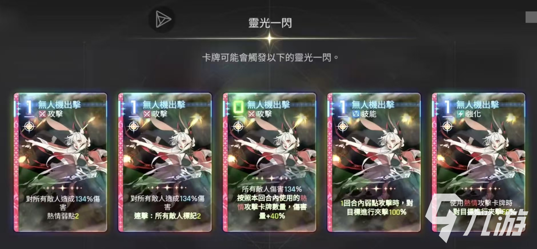 先来看一下自身的核心技能,在初始卡牌中,拥有一费的交战射击,可稳定提供100%伤害,还有一张一费的紧急遮蔽,能提供100%护盾,这样就解决了输出生存比较弱的问题。独特卡牌中,拥有捕捉目标技能,此技能可造成100%伤害,同时叠加标记。高倍瞄准镜技能是能适配各种战局,可叠加两层标记。对方被标记之后,再使用攻击卡牌就可以打出高额的额外伤害。无人机出击这个技能可对全体敌人造成伤害,并且附加热情弱点。