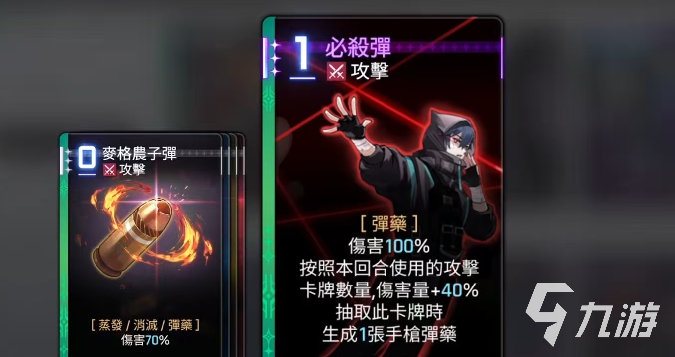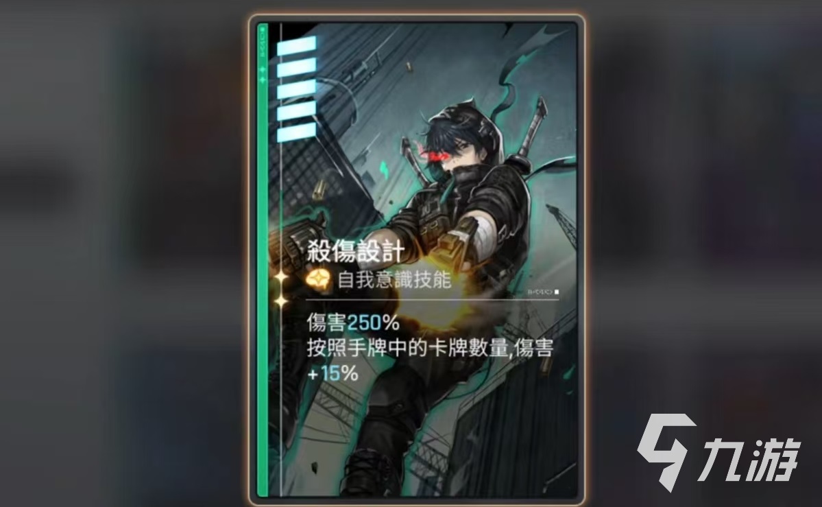 第二张是隐秘上膛,生成两张手枪弹药。第三张逮到机会,获得100%护盾,接下来使用弹药卡牌,伤害量增加120%。第四张是魔眼乱舞,按照本回合使用的弹药卡牌数量,使造成的伤害增加,这张卡就是一张拿来打爆发用的卡。第五张是必杀弹,伤害100%,按照本回合使用的攻击卡牌数量,伤害量再增加40%,在抽取到此卡牌时,可生成一张手牌手枪弹药。这张卡和魔眼乱舞非常相似,也是用于打爆发的卡。大招是杀伤策划,伤害250%,按照手牌中的卡牌数量,伤害量增加15%。大招和其他卡牌不同,这里并不是看使用的卡牌数量,而是手中的卡牌数量,所以记得在把弹药都用完前先使用大招。