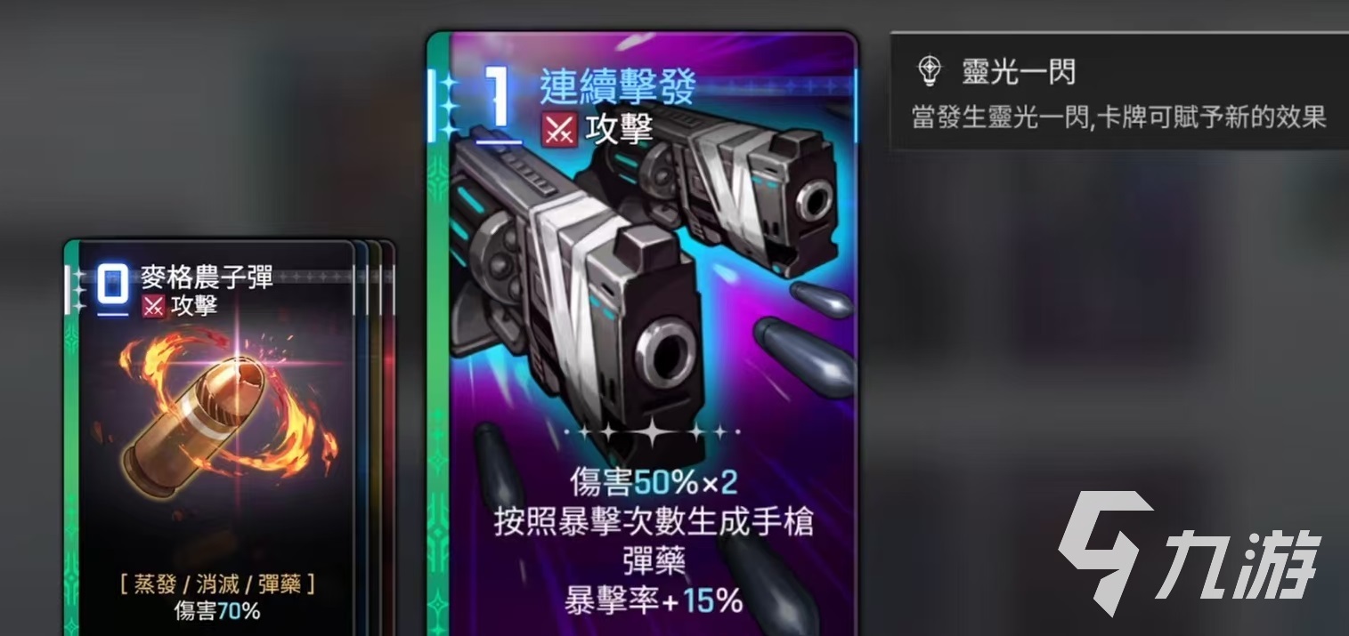路克拥有两张攻击起始卡牌,造成100%伤害,还有一张一费的技能卡暗影隐身,获得护盾。独特卡牌方面,第一张是连续击发,这张卡的伤害是两次50%,并按照暴击的次数生成手枪弹药,同时暴击率增加15%。通过这张卡就可以看出,只要将路克的面板堆到85%的暴击率,那么几乎就可以做到必爆。路克一共能够生成4种不同的手枪弹药,都是属于0费,主要包括曳光弹、贫铀弹、银弹等。这些子弹各自有不同的效果,例如银弹能够附加弱点攻击,贫铀弹可以使带有护盾的目标额外受到伤害。