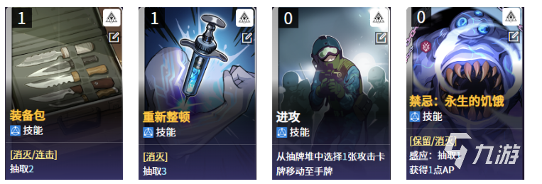 首先是辅助角色推荐去拿“装备包”、“重新整顿”、“进攻”和“禁忌永生的饥饿”,“装备包”直接无脑拿,能让队友使用卡牌后自动发动此卡效果不错且百搭,“重新整顿”和“禁忌”看到就拿属于比较难解锁的类型,“进攻”可以看情况选择,能帮助检索攻击牌。