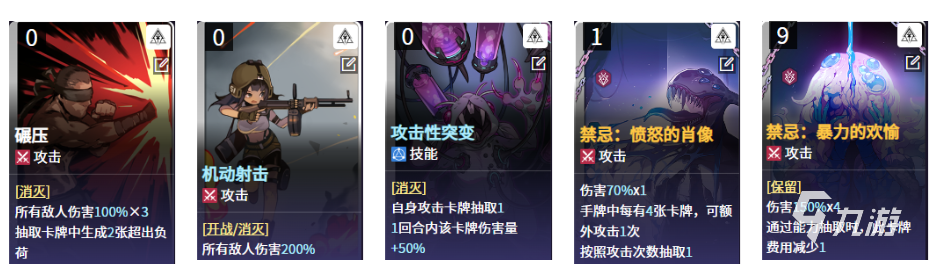 输出角色建议选“碾压”、“机动射击”、“攻击性突变”、“禁忌愤怒的肖像”、“禁忌暴力的欢愉”,“碾压”是单体输出必拿的,倍率惊人且副作用在能接受范围,“机动射击”是对所有敌人造成200%输出,适合清杂拿。