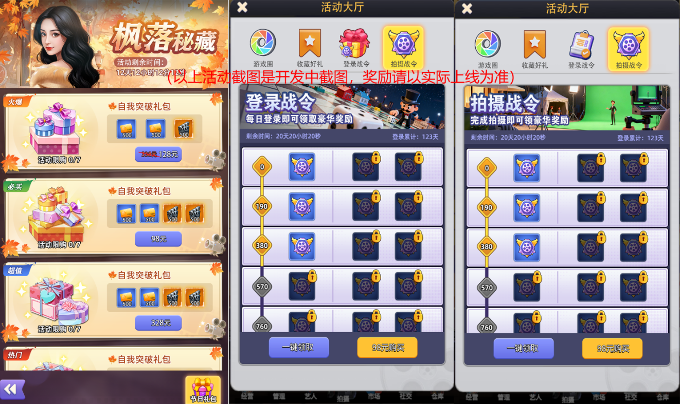 拍摄的热情正在高涨,【枫落秘藏】礼包悄然降临,钜惠礼包献上海量稀有资源礼包,希望各位导演每部影片的票房数据如枫火般燎原,更是为野心勃勃的导演们预留了直通年度票房冠军的秘径。并且我们为每一位怀揣票房梦想的导演精心打造「签到战令」+「拍摄战令」双轨冲刺计划,让这个秋日因你的参与而火热。每日登录并完成日常拍摄任务,即可领取钻石、抽奖卡等珍贵奖励等你收入囊中。这个秋天,让我们携手打破票房纪录,用行动点燃银幕之光