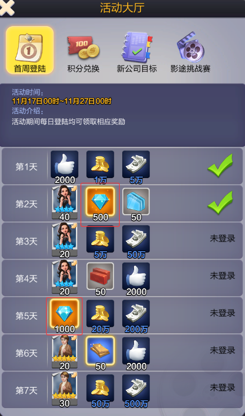 2:首周7日登录签到可以免费领取1500钻石,就算没时间也要每天上去点一下签到奖励哦