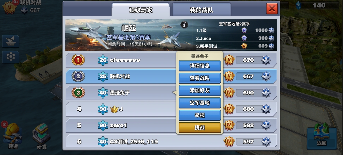 S3/S4 赛季新增专属武器与建筑:S3 的自动维修站可自动修复建筑,电磁炮能让敌机武器失效 11 秒;S4 的加固装置提升建筑 30% 血量,云爆弹可封路持续掉血,激光炮能减速敌机。指挥部升级需满足繁荣度,点击待升级图标可直接跳转,操作便捷。新增空军基地挑战模式,黄金段位以上玩家可发起挑战,排行前 10 仅能互战,11-200 名可挑战更高排名玩家,每日 3 次挑战机会。挑战成功获星阶与挑战币,失败扣除星阶,24 小时未被驱逐才算获胜,挑战币可兑换海量道具。