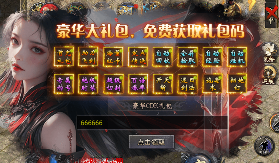 1.新人上线即可在游戏界面豪华大礼领取豪华福利大礼包,礼包码默认666666,各种豪华福利免费送!