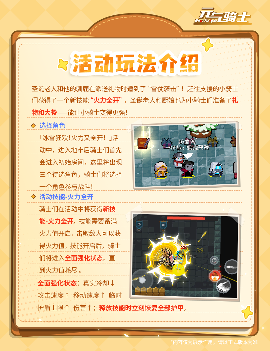 当冰雪节撞上“火力全开”返场,「冰雪狂欢!火力又全开!」活动火热登场!厨娘带来冰雪节料理,圣诞老人为小骑士们准备了“奇迹礼物”!这个冰雪节,一起对战庆典雪人王!