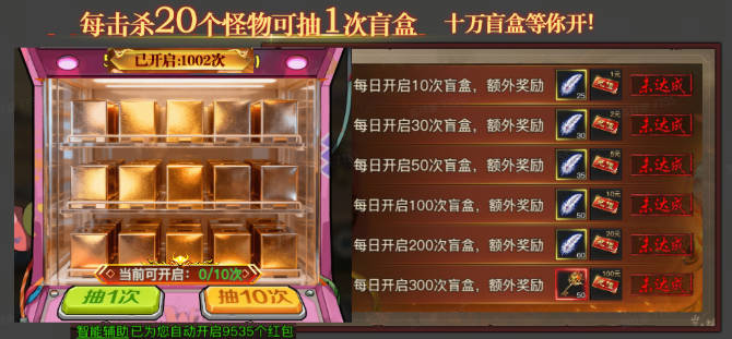 活动期间完成怪物击杀数量等任务,可获得盲盒奖励,盲盒必得红包、充值卡、典藏珍稀道具等;
