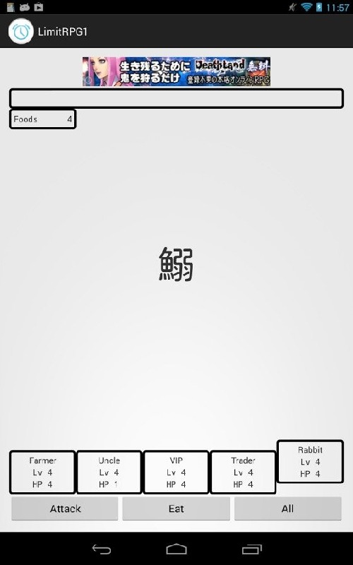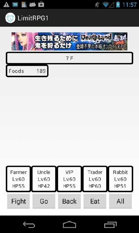 This is the very simple Role Playing Game (RPG). Let's go to Floor 10!What you can do in this game is limited. - Find enemy- Go to next floor- Go to previous floor- Eat food (cure 1 character)- Share food (cure all character in 1 food)