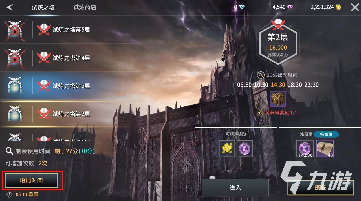 当玩家角色等级达到27级时就会开启试炼塔玩法,试炼塔不限制进入,但是在塔中击杀怪物获取的收益,是有时间限制的。必须在规定时间内击杀怪物才可以获得奖励,当剩余时间大于零时,可以提前购买叠加次数。在试炼塔中清剿怪物,能获得大量经验,是玩家在整个游戏过程中获取经验的重要途径之一。尤其是在前期卡主线之后,就可以来参与试炼塔,很快就可以将等级提升上去,继续去做主线。