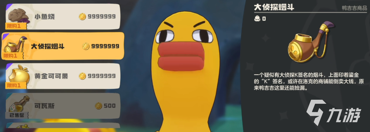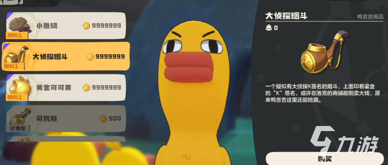 在测试版本中还有个鸭鸭商店,可以去买各种道具,其中就有一千万的大侦探烟斗、黄金可可果等。这里剧透一下这个黄金可可果是放在背包里的,但是点击查看那并没有什么反应,有可能是内测还没有做这部分的内容,也有可能就单纯是给大家收藏用。