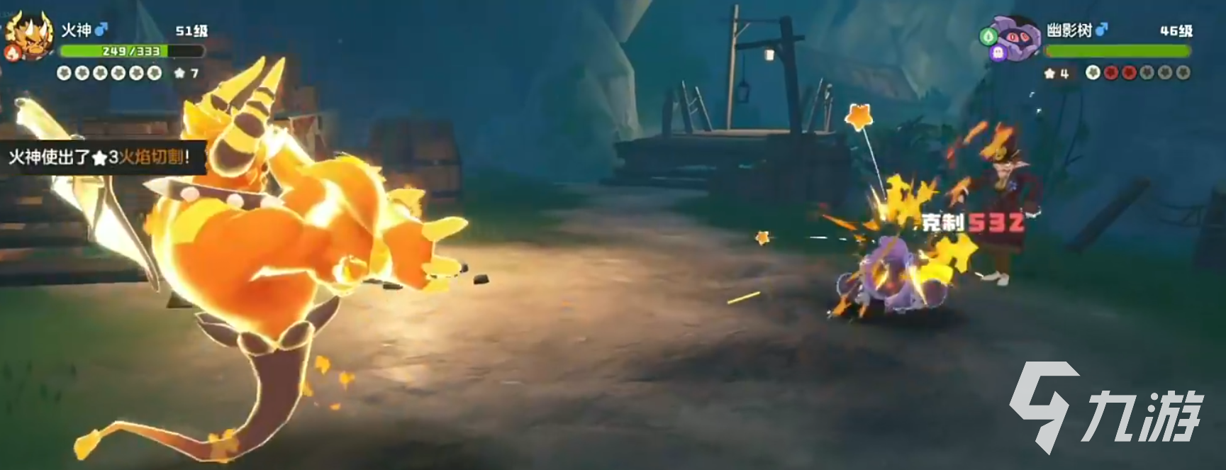 此时我们就不能使用被其克制的星光狮,建议去替换瞌睡王上场,这样能全方位克制完胜对方,并且队伍中如果有哪只精灵聚能了,瞌睡王也能享受到聚能带来的加成效果,随后用崩拳等攻击技将对手给轻松拿下,他的第3只是草加幽灵的幽影树,此时建议去上带有克制的火神,一发火焰切割就能带走。