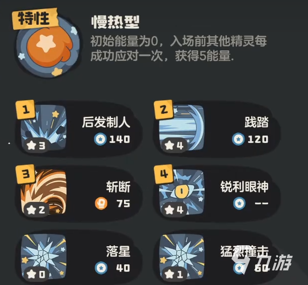 这个精灵的特性是慢热型。这个被动并不算很好,它让动力猿在入场的时候初始能量为0。在入场之前每个精灵每成功应对一次便可以获取到5点能量,在很多情况下应对的触发并不会很容易,所以动力猿不少时候入场都没有能量。