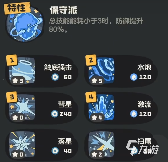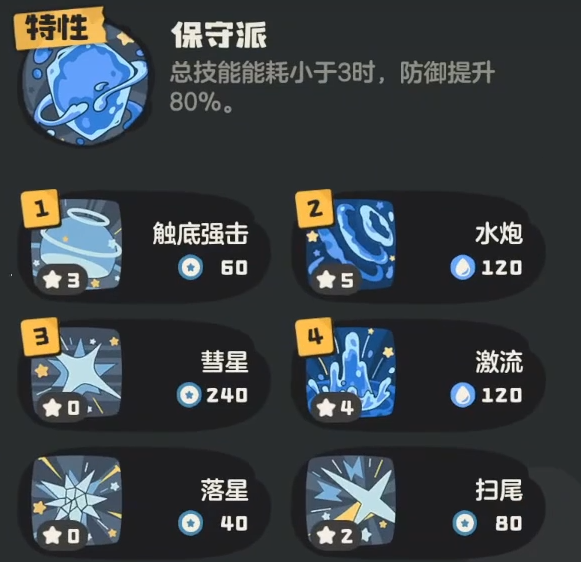 此精灵的特性为保守派,这个特性是燕尾獭自身的总技能消耗小于3的时候,它的自身防御将会提升80%。这个特性在前中期会有着很大的用处,因为前期技能消耗很低,我们可以在很长时间都可以保持防御加成的状态。