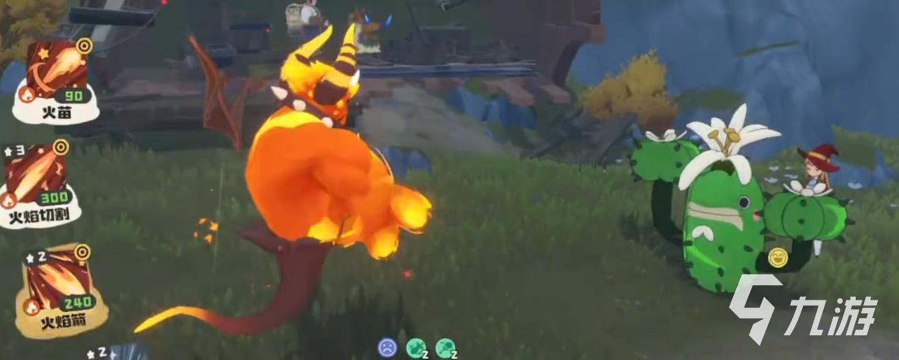 紧接着的第二和第三个精灵依旧是蹦蹦花,只是它们头顶小草的顏色有所不同,分别是紫色和粉色,但属性与弱点不变,同样可以用“火焰切割”迅速解决。乔娜这个npc对战仿佛是为火神量身定制的。
