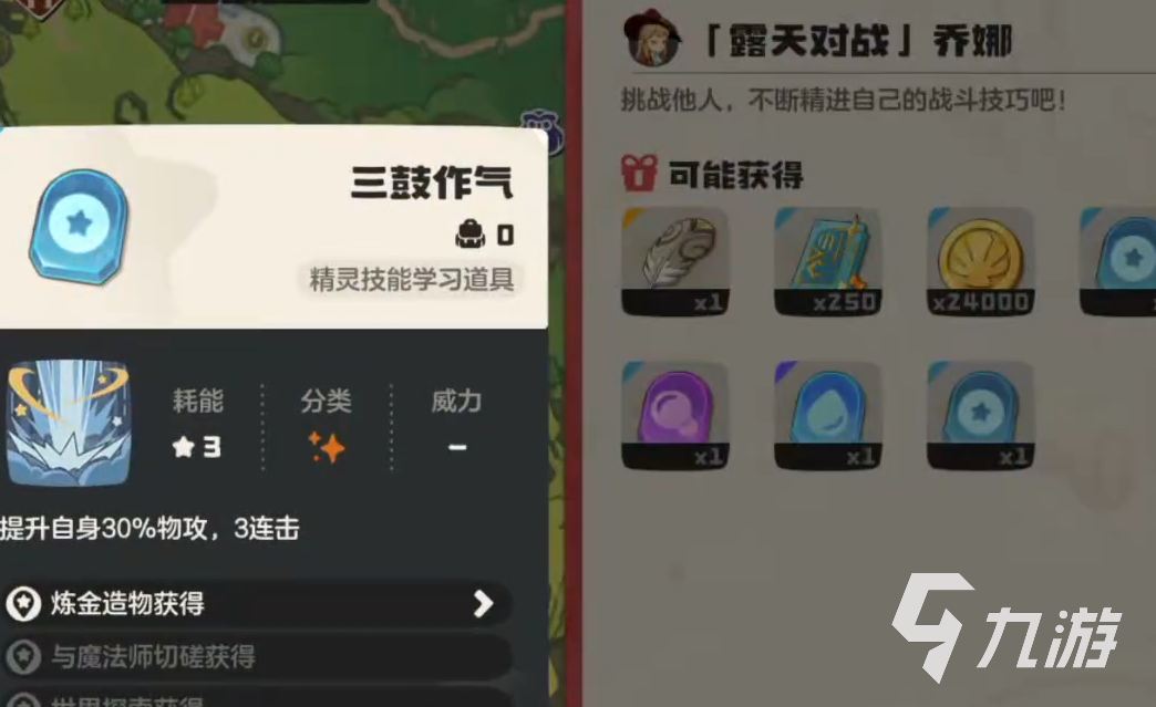 不过,得益于火神的“助燃”特性,使用消耗较低的二星技能“火焰剑”依然能够成功击败前两位蹦蹦花。第四个蹦蹦花,其头顶是红色的草,这才是该精灵的常规样貌。利用属性克制的优势,可以稳稳地拿下这第二场战斗的胜利。洛克王国世界乔娜对战的奖励主要是智慧羽毛、经验、洛克贝,还有技能书:三鼓作气、溶解液、水刃、能量炮,都是蛮不错的技能。