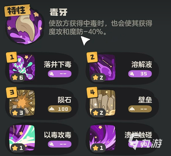 关于技能的携带,目前玩家们比较常用的是落星,溶解液,毒针和不可触碰。基本上绝大部分的技能都是属于毒系技能,配合多多本身的特性,可以在毒的层数高了之后能够造成大量的伤害。