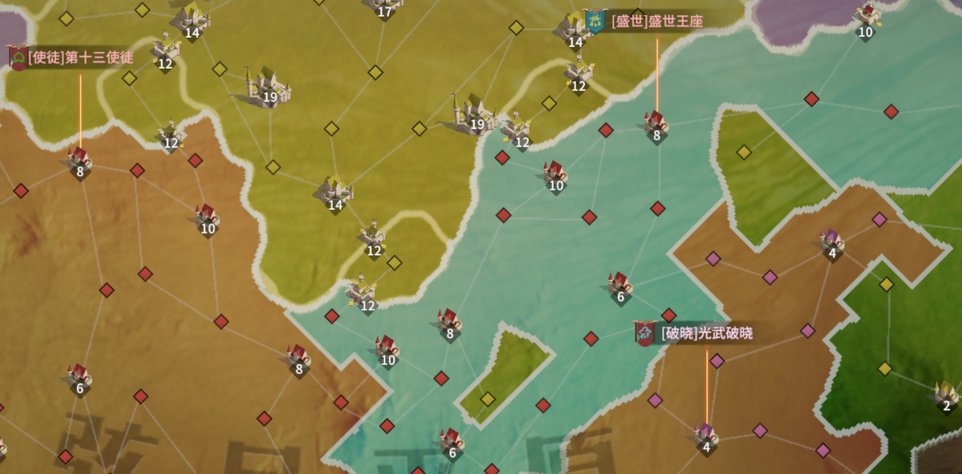 总体局势较为明朗,【第十三使徒】和【盛世王座】组成同盟【王座】再续前缘,强势控下弦月平原,尽管【光武破晓】在弦月平原也是一方霸主,但似乎暂时无法染指资源州关隘。