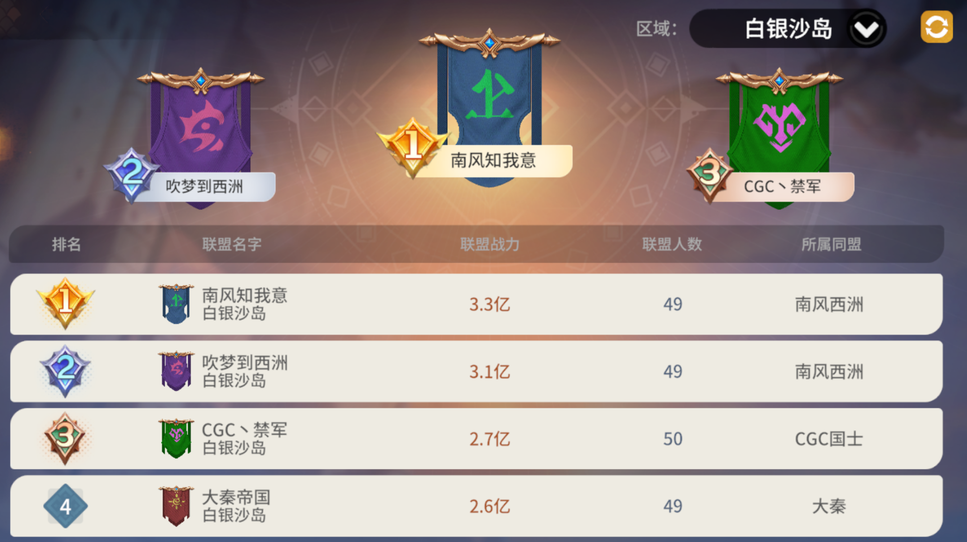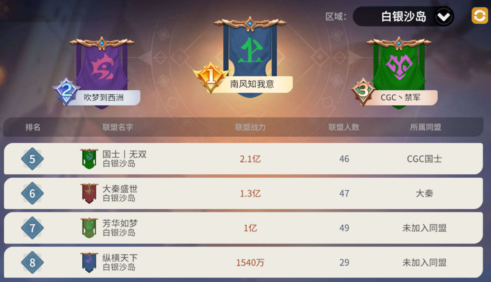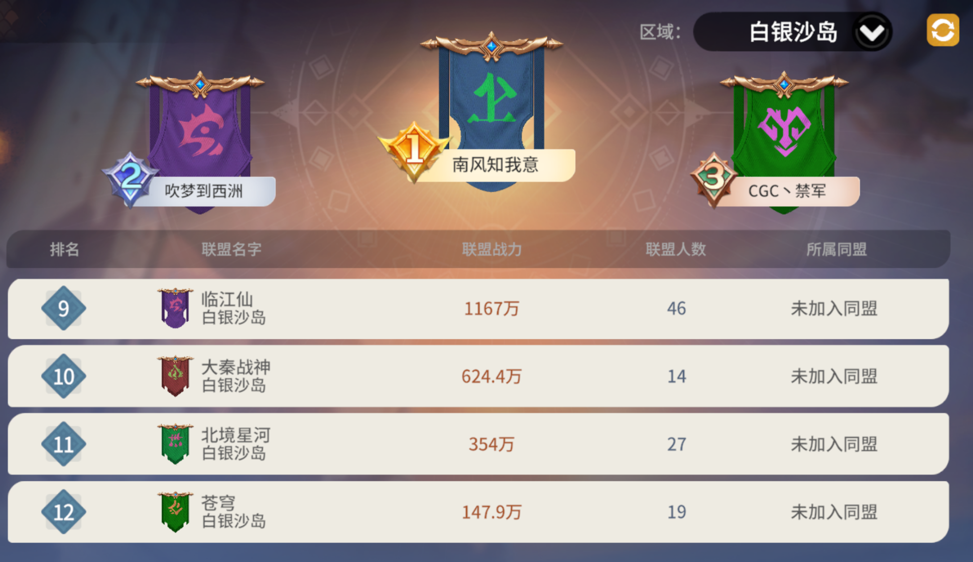 来到白银沙岛,截至今日12:00,白银沙岛共有13个联盟,总体可分为三大势力:他们分别是以上赛季【沧海】为班底的【南风知我意】和【吹梦到西洲】、卷土重来的【大秦】、【CGC丶禁军】和【国士丨无双】也是相互扶持多时的盟友。