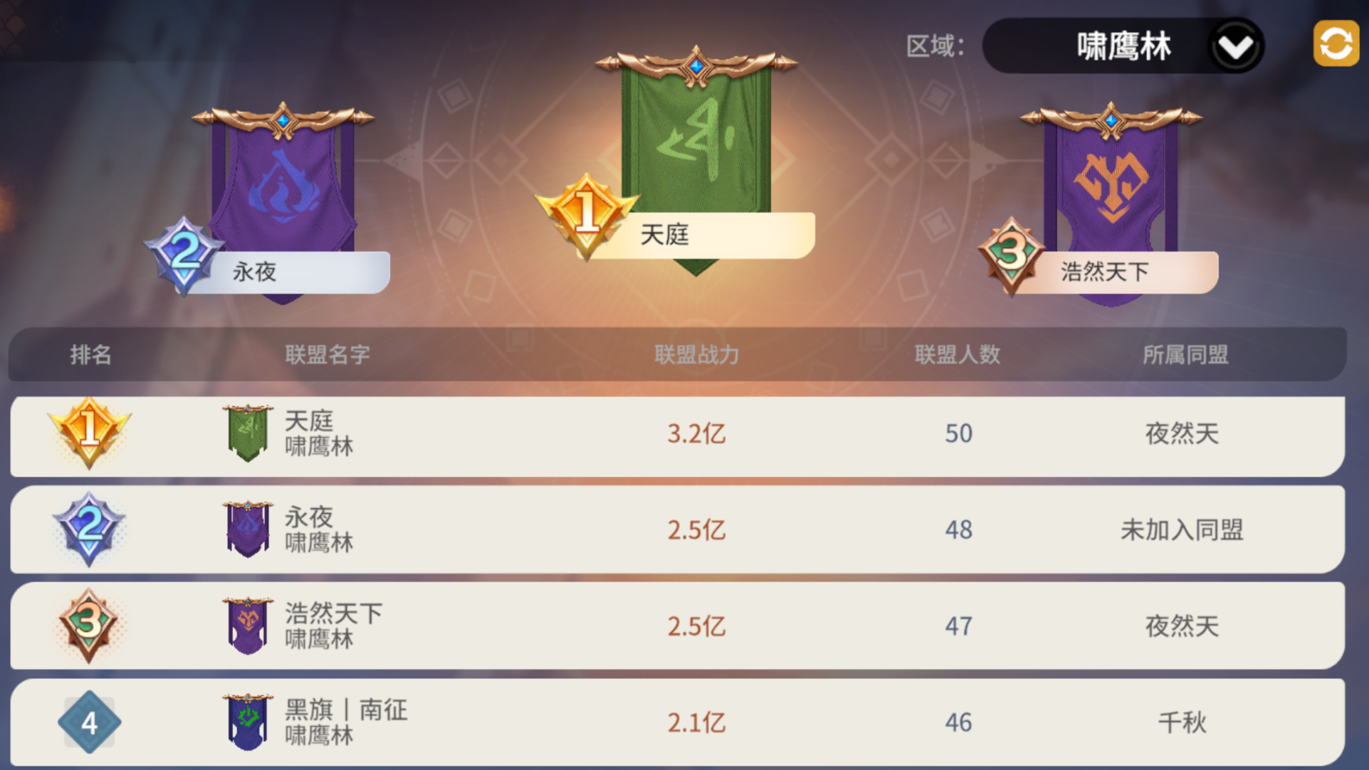 先来看S2赛季全局情况,截至今日12:00,【南风知我意】以3.3亿总战力占据联盟战力排行榜首位,【天庭】以3.2亿战力夺下第二宝座,第三则由3.1亿战力的【吹梦到西洲】拿下。