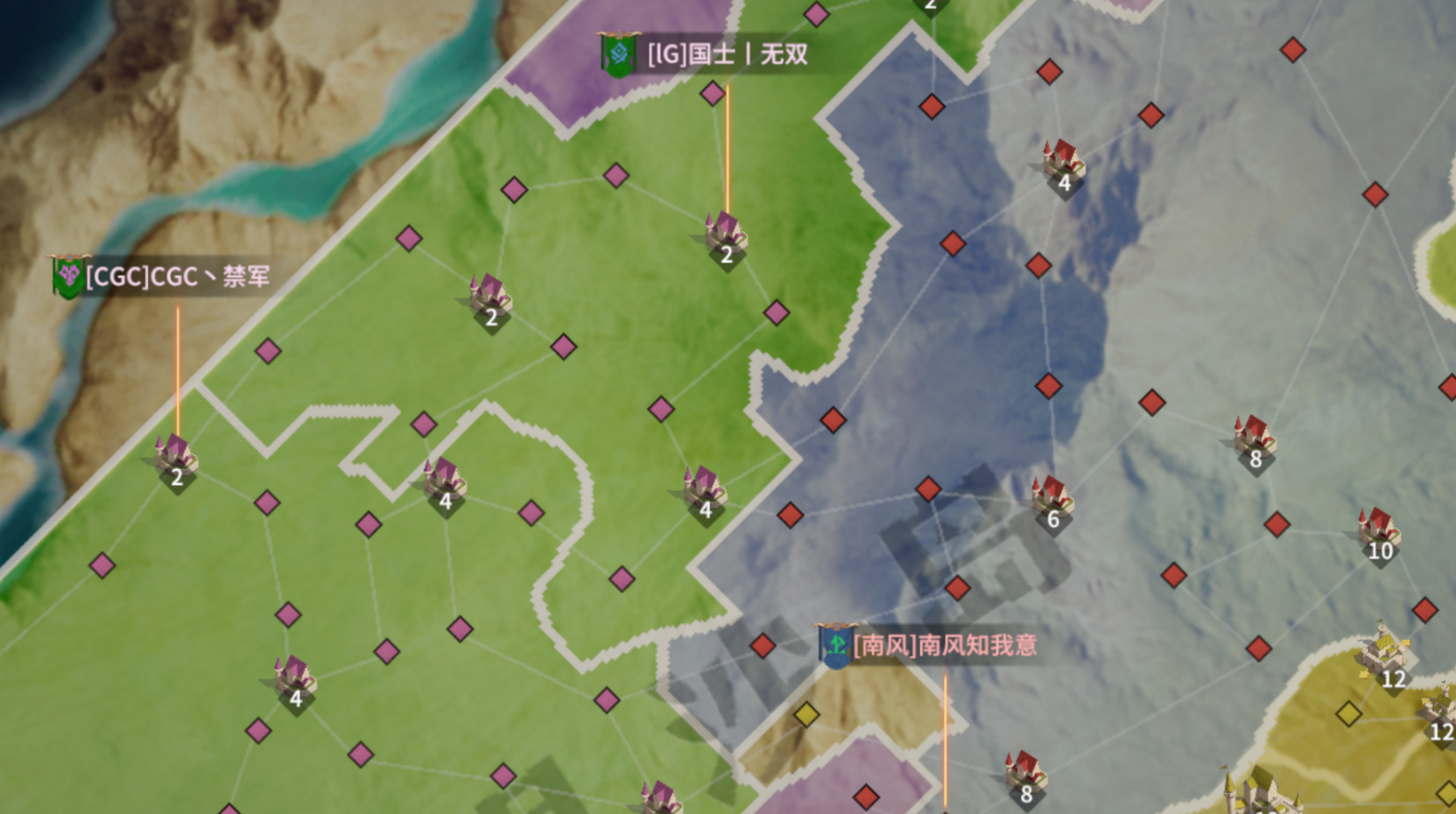 可S1赛季3501服龙腾高地的一幕再次上演:【南风知我意】和【吹梦到西洲】组成同盟【南风西洲】压制【大秦】,后者未能推进至资源州关隘前;而另一边的【CGC丶禁军】与【国士丨无双】也未能冲出包围圈,白银沙岛通往资源州的关隘即将落入同盟【南风西洲】之手。