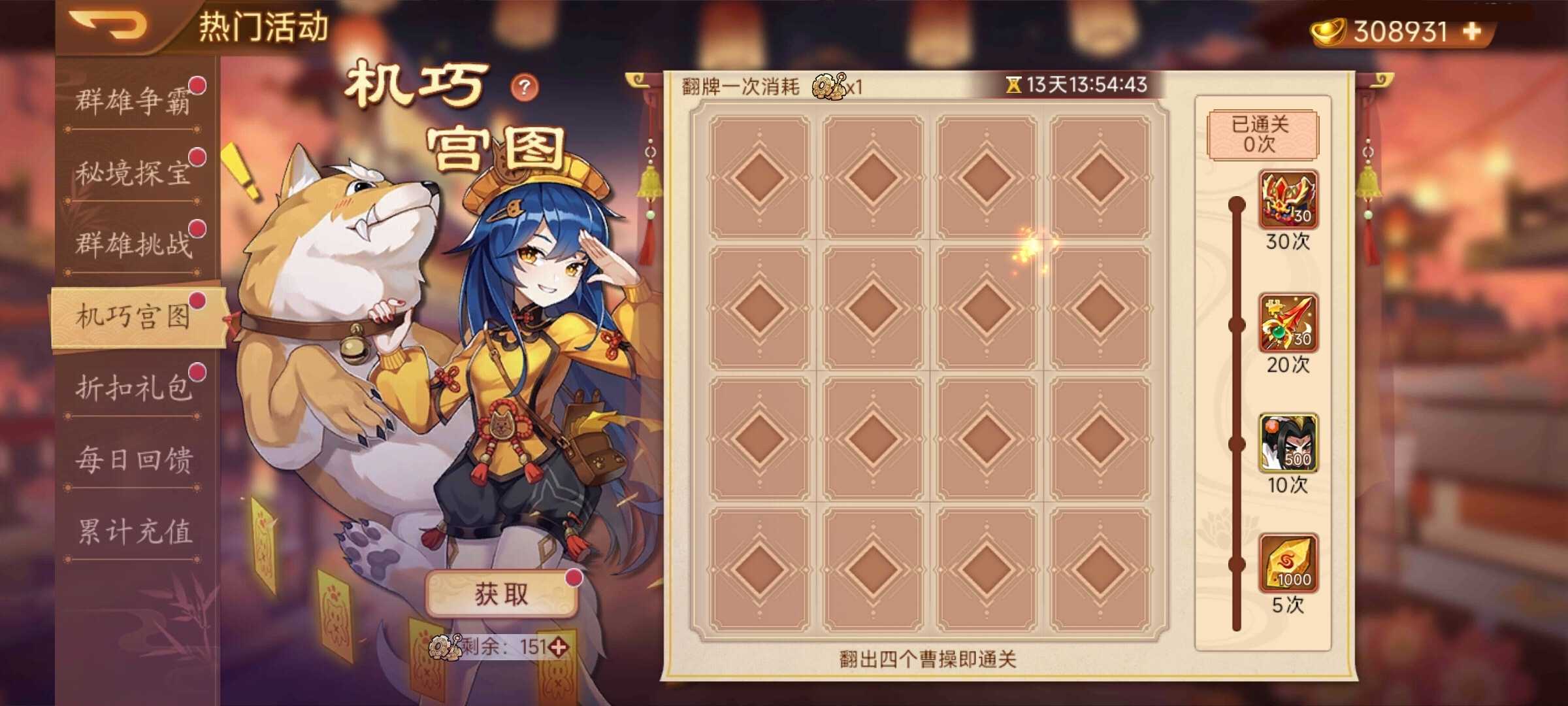 活动内容:活动期间,可通过消耗机关钥匙进行翻牌,翻到4个曹操即可进入下一关卡,通关关卡次数达到目标值即可获得奖励。