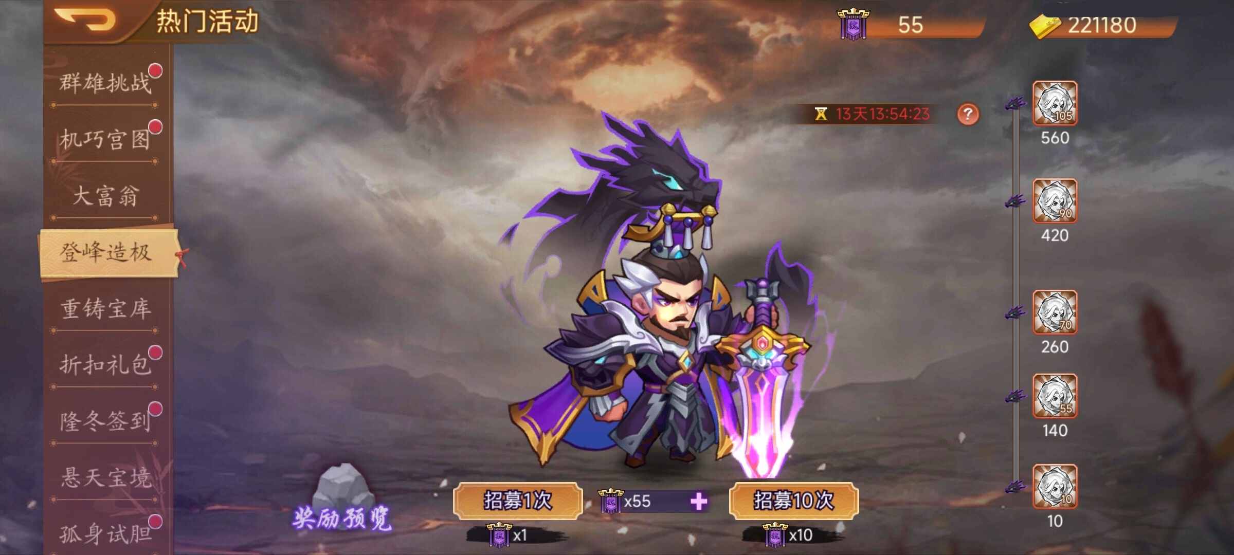 活动内容:活动期间,可通过消耗招募令进行招募武将,up武将的概率会高于其他同档位武将(每期活动会更换up武将),每次招募可获得10名望,名望可在名望商店兑换道具。