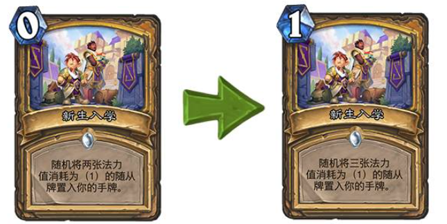新生入学从0费改成了1费,说实话,对于这张卡的改动,小编觉得非常失败,新生入学这张卡多见于标准模式里的骑士,而作为一张补充资源的卡,0费真的没什么,君不见牧师术士的0费复生回手?这才应该改成一费才合理。