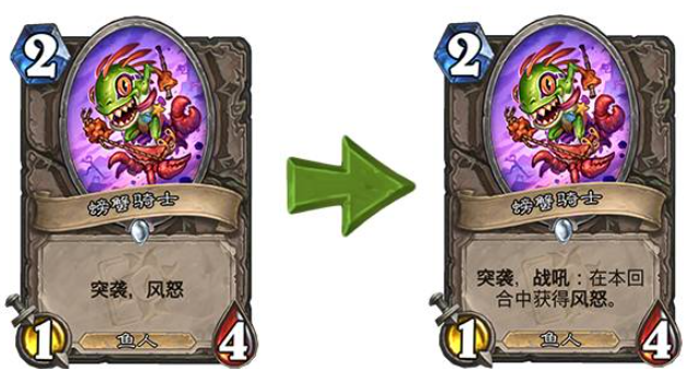 改为本回合可以风怒,解场返场能力削弱,其他方面不变,对快攻站场是削弱,对其他卡组还好。