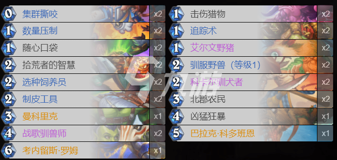 在野猪猎的起手留牌方面,主要是以集群撕咬,数量压制,随心口袋,拾荒者的智慧,选种饲养员,制皮工具,曼科里克,击伤猎物,追踪术,艾尔文野猪,驯服野兽(等级1),科-卡尔驯犬者,北郡农民,凶猛狂暴等低费卡牌为主。