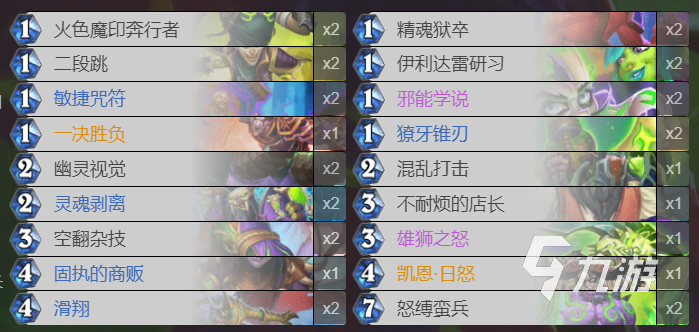 在雄狮瞎的起手留牌方面,主要是以固执的商贩,精魂狱卒,伊利达雷研习,火色魔印奔行者,二段跳,敏捷咒符,一决胜负,幽灵视觉,灵魂剥离,空翻杂技,邪能学说,獠牙锥刃等低费卡牌为主。