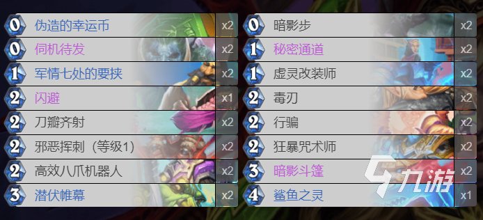在卡组的解场方面,有:军七的要挟,毒刃,虚灵改装师。在卡组的过牌方面,有:秘密通道,潜伏帷幕,行骗。总得来说,这是一套通过盗贼的过牌体系迅速过牌,然后利用直伤一波斩杀的otk卡组。