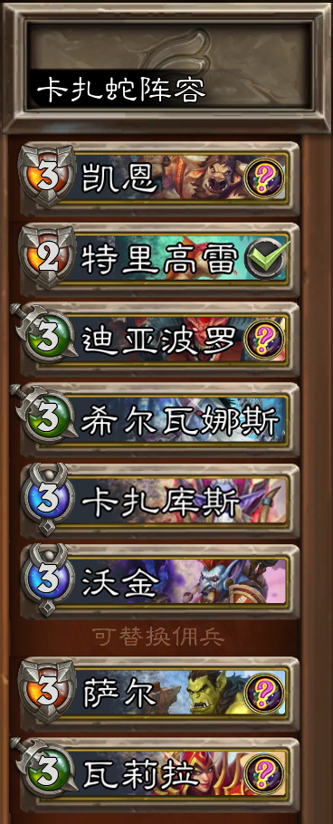 首先考虑对后备的加成能不能更多,卡扎的卡组就是这样的思路。由于蛇的2技能具有保镖的特性,他可以吸引火力,所以他可以对养成类阵容的小核心进行一定的保护,所以他适合与具有一定成长性的佣兵进行搭配,例如吉安娜,卡扎。