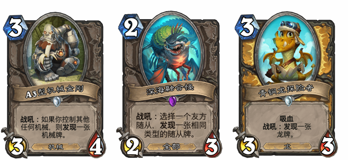 而还有一个已经可以提前/继续骂的环境特征就是过于影响胜负的发现了,哥俩称之为摸奖式发现,也就是曾经的矿道/哥利亚、红龙女王等。很不幸,矿道的禁选和巨龙降临的退去并不意味着摸奖式发现的终结,这次摸奖的“奖”新增了沉没之城的各种带种族标签的巨型随从,同时哥利亚也还在环境里;摸奖的“摸”则主要是指深海融合怪和核心系列回归的A3型机械金刚,其中后者可是白卡。根据Adwcta的计算,法师和骑士从A3里发现巨型机械或哥利亚的概率高达35%——骑士同时还能享受青铜龙探险者的回归,它发现团本/红龙/死亡之翼的概率更是高达40%。