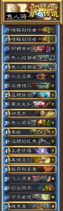 炉石传说欧服第三圣盾鱼人骑 夜色镇快攻鱼人流 还是鱼人骑,最近鱼人快攻流统治了外服的传说前列,这次为大家带来的是加入了夜色镇执法官的圣盾快鱼...[详情]
