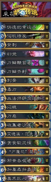 这套炉石传说采花贼卡组来源哀绿发的登顶卡组,本人也喜欢玩盗贼,就随手抄了一套,12点开打,一下午功夫,玩了50场,37胜13负从四级就到传说...[详情]