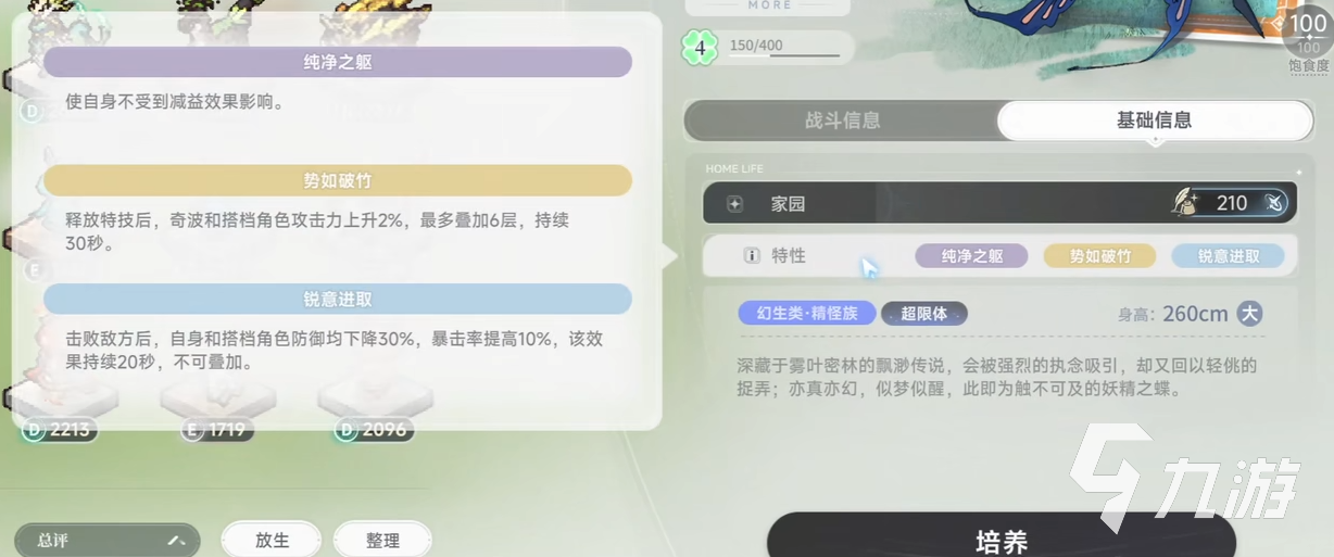 以上就是关于蓝色星原旅谣森林灵蝶怎么收服,以及这只奇波技能特点与表现的大致介绍,除了主动技能还有几个小技能是自动战斗时候用到的,有风属性旋涡球可以牵引敌人聚怪,有光属性连续发射的光弹,还有可以清空架势条的技能。特性也不错,很适合搭配主C使用。