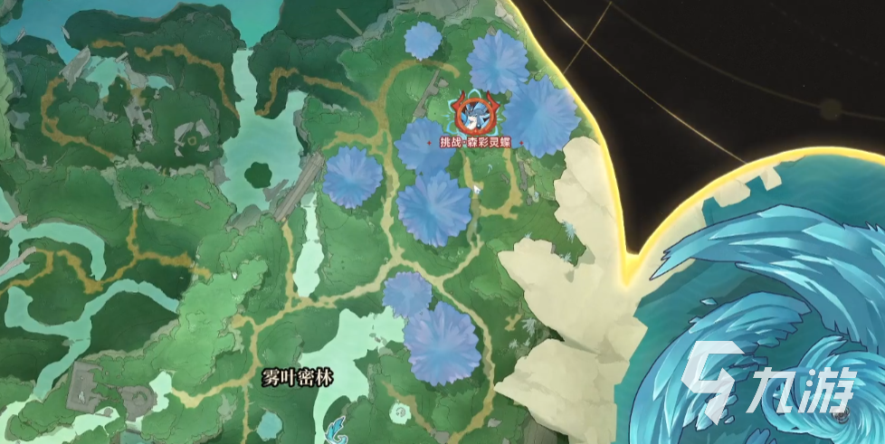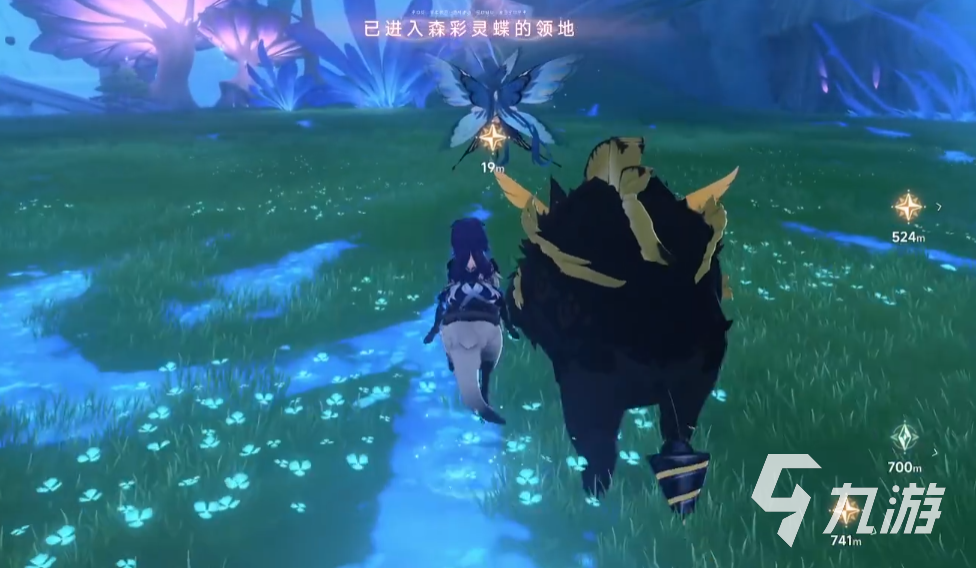 森彩灵蝶第一章大地图上的挑战boss,位于雾叶密林的右上方,首测的时候没有直达的传送点,需要先到附近的点在飞过去过着跑过去。靠近会显示进入森彩灵蝶的领地,有时候还会遇到异色的,名字上会标出来。