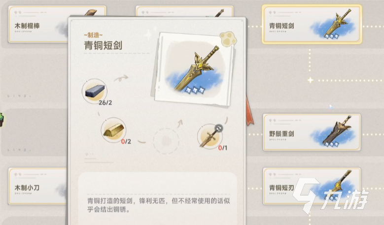 制作武器需要用到不同种类的矿石,而矿石除了采集,一些高级矿石则需要通过砖窑、熔炉来制作,比如说比较常见的风铜锭,还有一些武器例如“野鬃重剑”,自然是需要特定boss的战利品了。素材收集需要时间,武器制作也需要较长的时间。