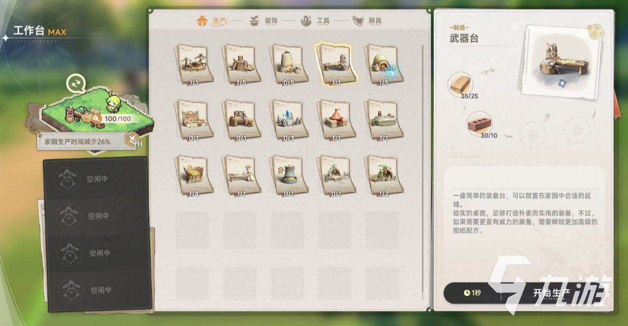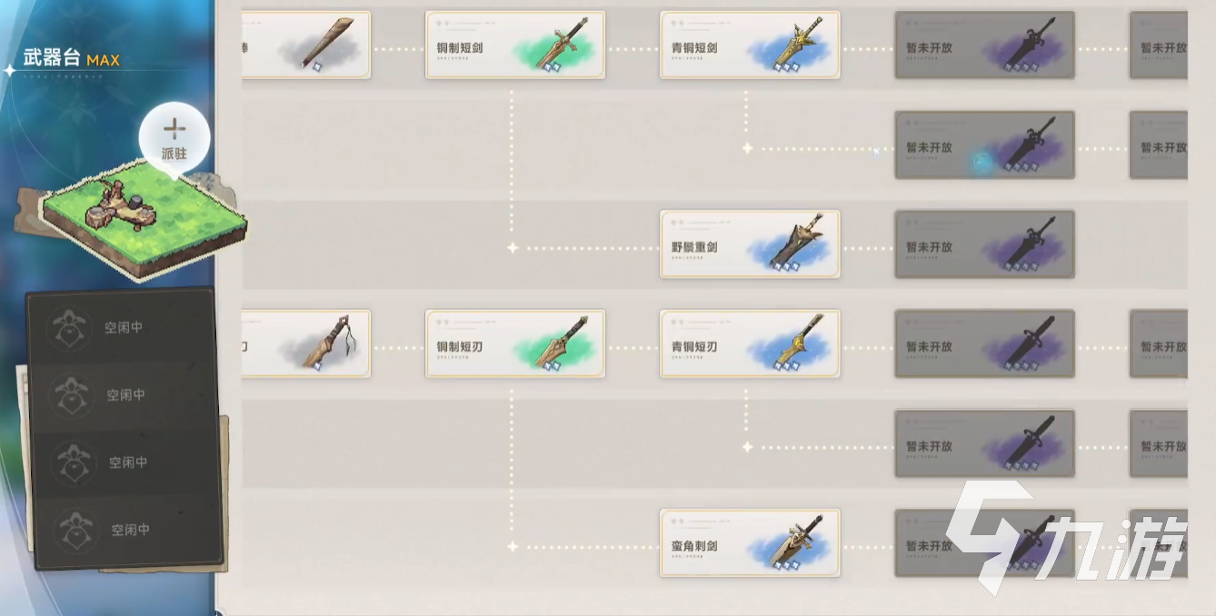 先是制造“工作台”,然后制造“武器台”,制作好了之后就可以陆续制作不同的武器。根据角色所能装配的类型武器分为:剑、弓、法杖。还是能较为明显的区分出角色使用什么武器的,例如末音使用剑,璐璐卡使用法杖。