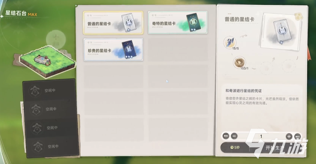 星结卡的获取渠道有不少,最稳定的还是家园产出,先制造“工作台”,然后制造“星结石台”,可以看到有普通、奇特、珍贵三个级别的星结卡,对应白绿蓝的卡。而从星结界面来看,还有紫色、橙色的星结卡。