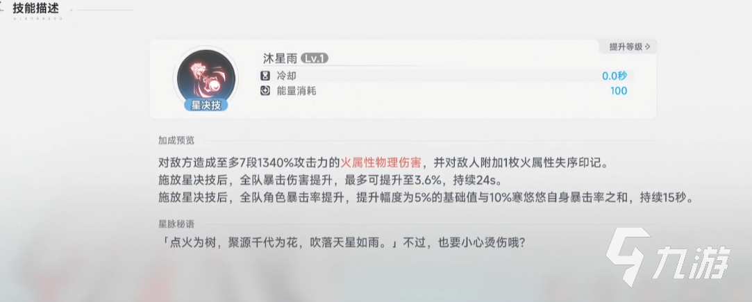 大招是7段高倍率的火属物伤,同时给敌人挂1层火属性失序,使用大招后全队暴伤提升,持续24秒;暴击提升,提升幅度与5%的基础值外加10%寒悠悠自身的暴击率之和,持续15秒。